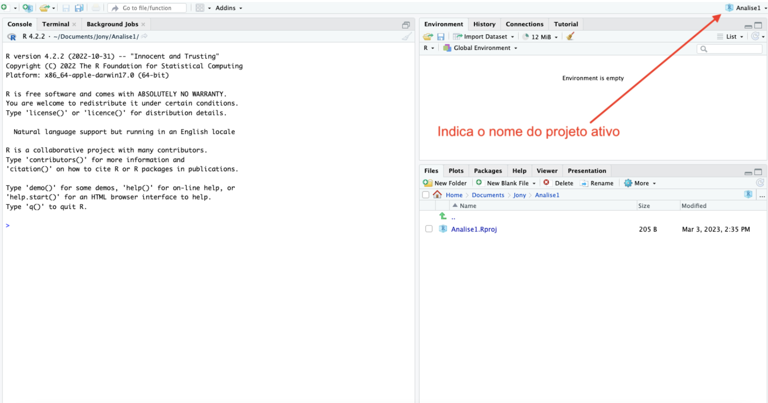 Uma vez criado o projeto, o Rstudio mostrará que o projeto está ativo. Além disso, é possível ver o conteúdo da pasta do projeto na aba files e o R irá entender que este diretório é o diretório de trabalho.