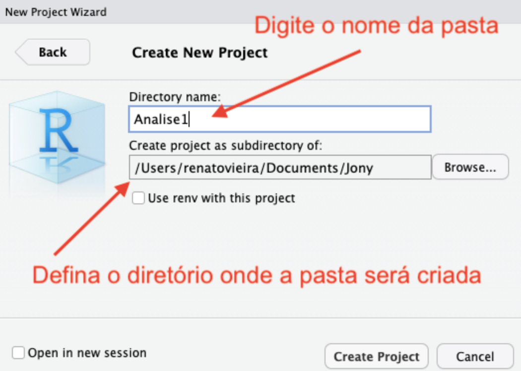 Se quiser verificar o diretório que o R está considerando como “de trabalho” (working directory), digite no console getwd(). O R irá retornar o caminho do diretório do projeto em seu console.