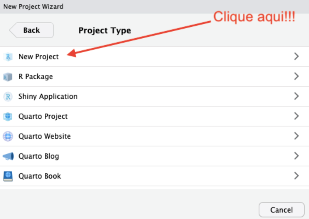 Na janela seguinte, escolhemos o tipo de projeto. Por ora, vamos apenas criar um novo projeto.